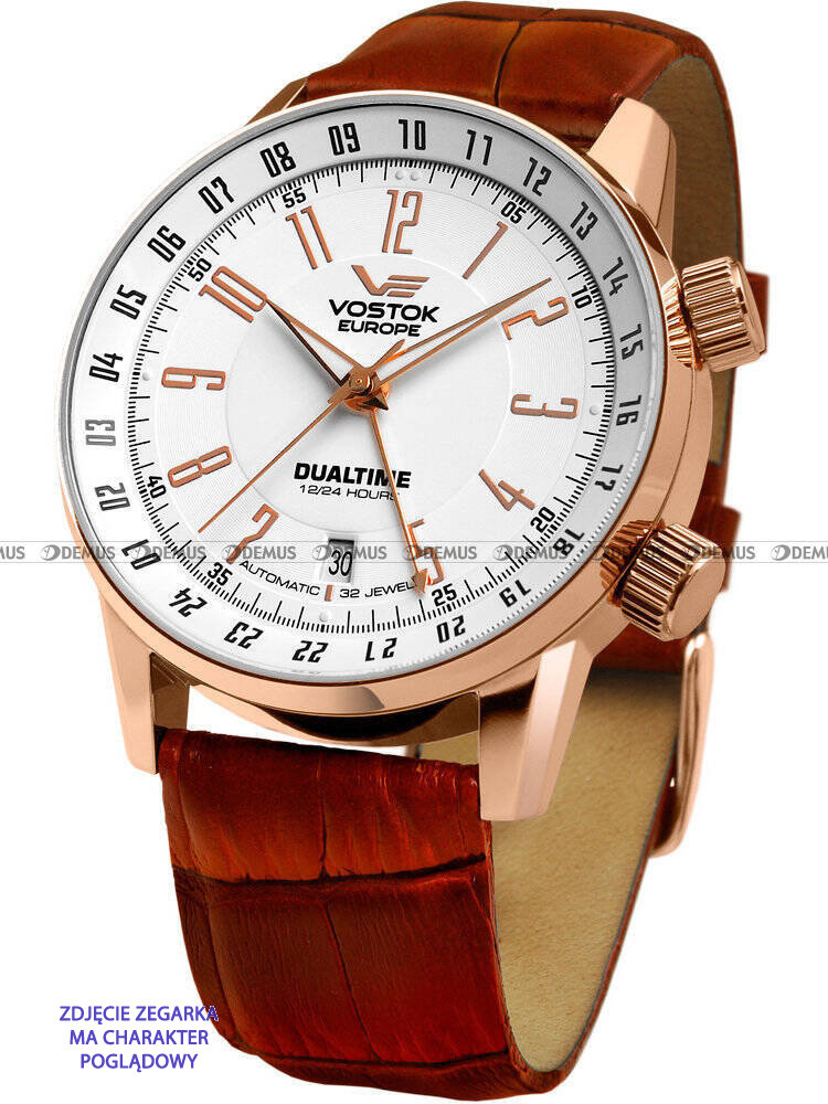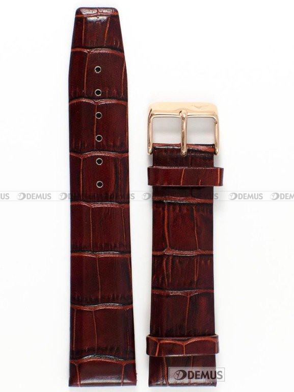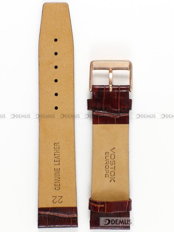 Pasek wykonany z naturalnej skóry w kolorze brązowo-bordowym o szerokości 22 mm i fakturze aligatora. Przeznaczony dla serii zegarków Vostok Europe Gaz-14 Dual Time ze szczególnym uwzględnieniem modelu 2426-5609060. Klamra w kolorze różowego złota, błyszcząca.garka.