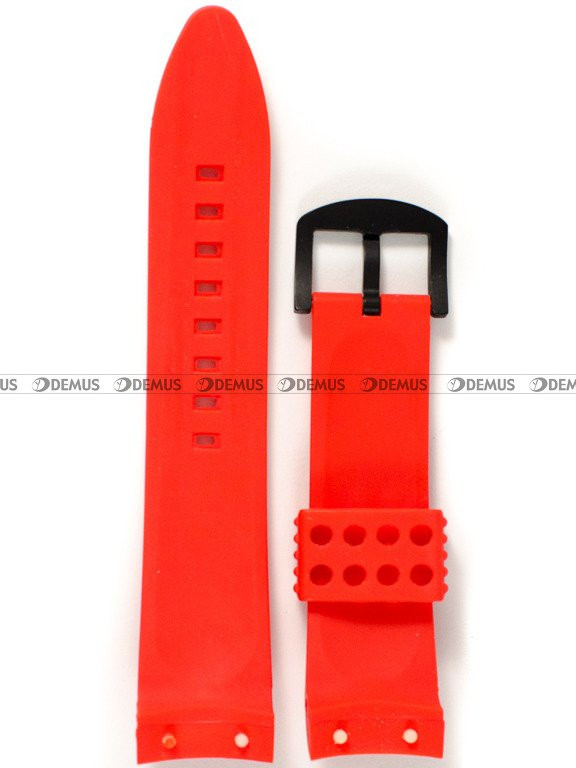 Klamra w kolorze czarnym matowym, logowana logiem zegarków Vostok Europe. Pasek wykonany z silikonu posiada kolor czerwony – idealny na lato aby przykuć uwagę na nadgarstek. Pasek ma szerokość odpowiadającą serii zegarków Vostok Anchar czyli 24 mm.