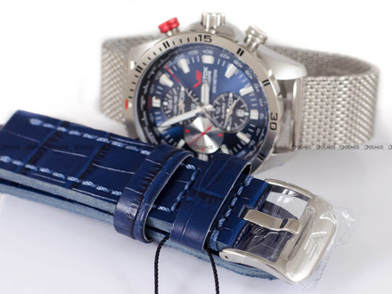 - Chronograf z czerwonym przyciskiem podkreśla sportowy charakter zegarka i nawiązuje do modeli lotniczych oraz wyścigowych.