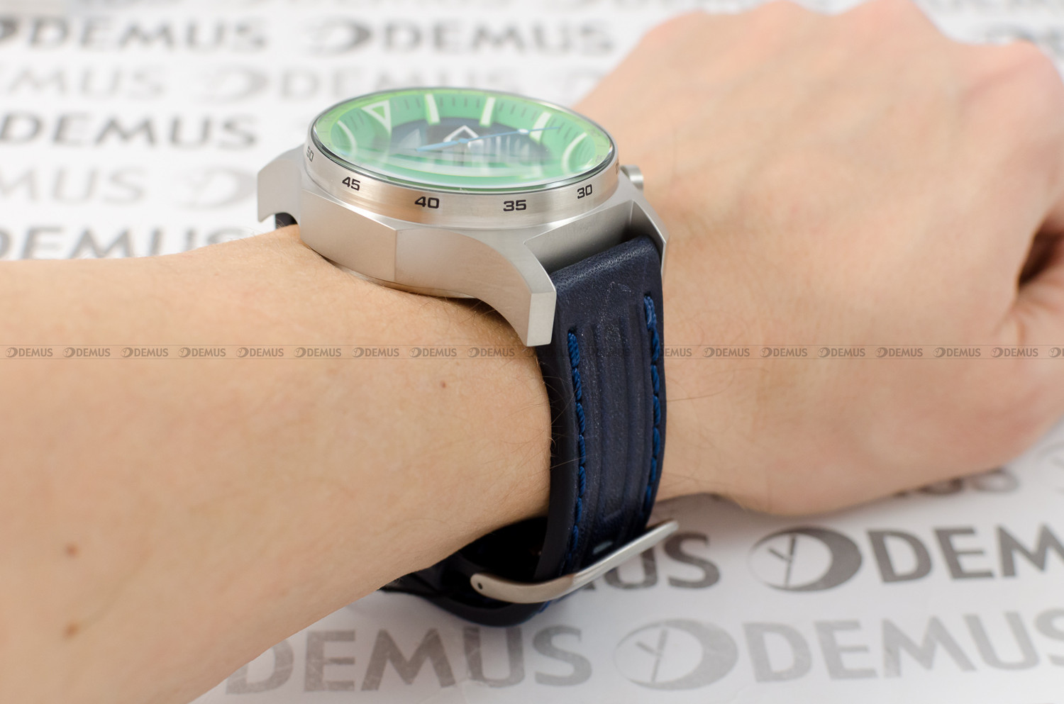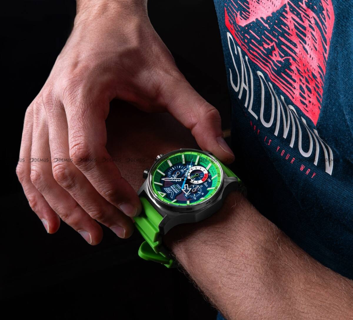 - Unikalny design – matowa srebrna koperta w połączeniu z zielono-czarną tarczą i czerwonymi akcentami nadaje zegarkowi wyjątkowy charakter.
