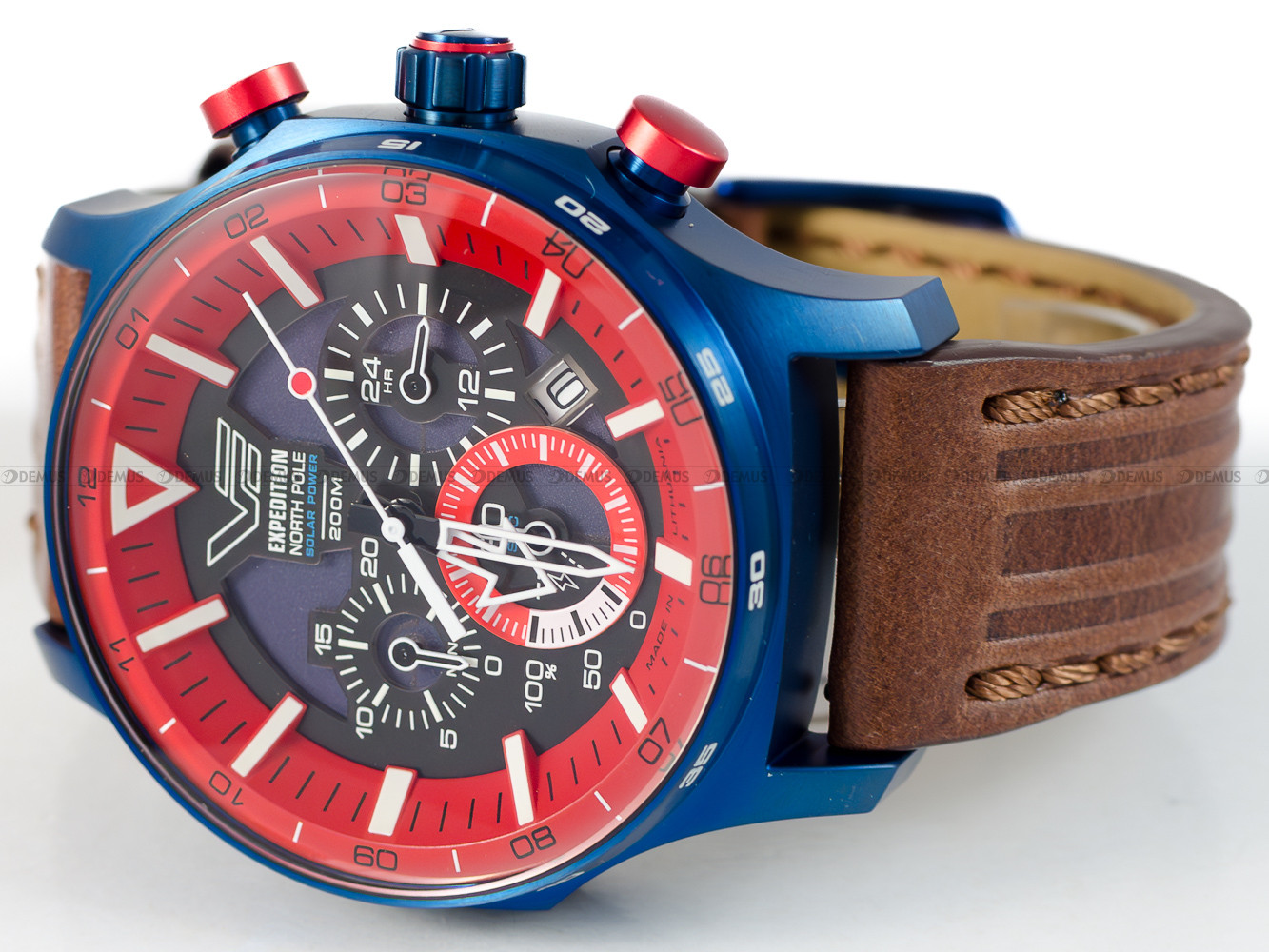 Model Vostok Europe Expedition North Pole "Polar Sunrise" VR42-595D734 to wyjątkowy zegarek inspirowany zjawiskiem polarnego wschodu słońca, charakteryzujący się niebieską kopertą, czarno-czerwoną tarczą oraz czerwonymi przyciskami. Zestaw zawiera dwa paski: elegancki brązowy skórzany oraz dynamiczny czerwony silikonowy, umożliwiające personalizację zegarka według upodobań.