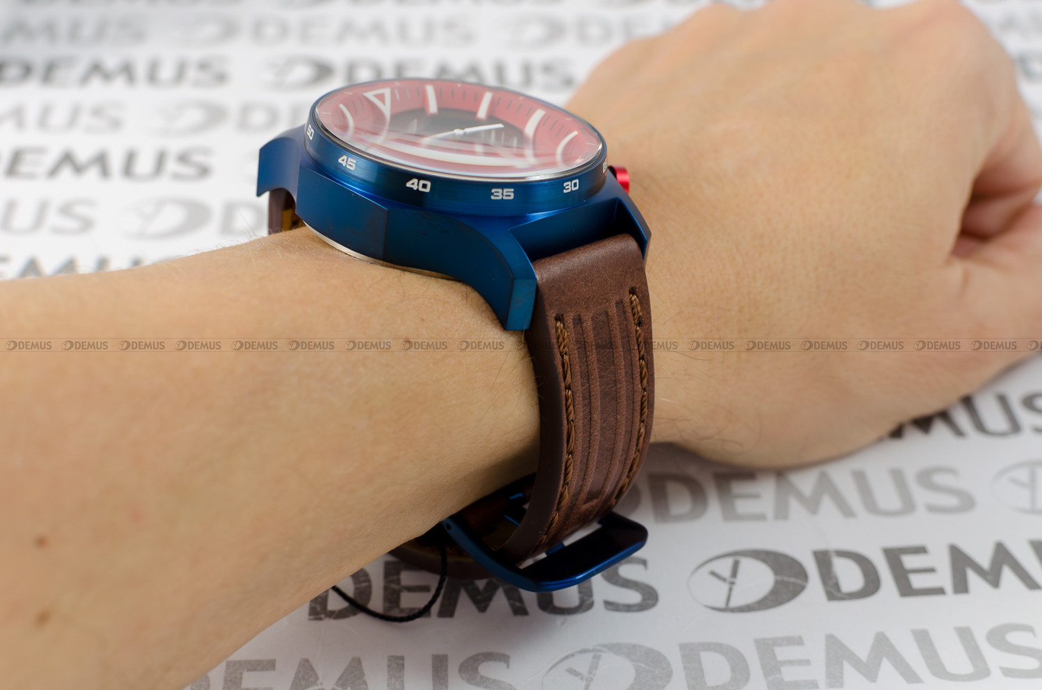 - Unikalny design – niebieska koperta w połączeniu z czarno-czerwoną tarczą oraz czerwonymi przyciskami tworzy wyrazisty i nowoczesny wygląd.