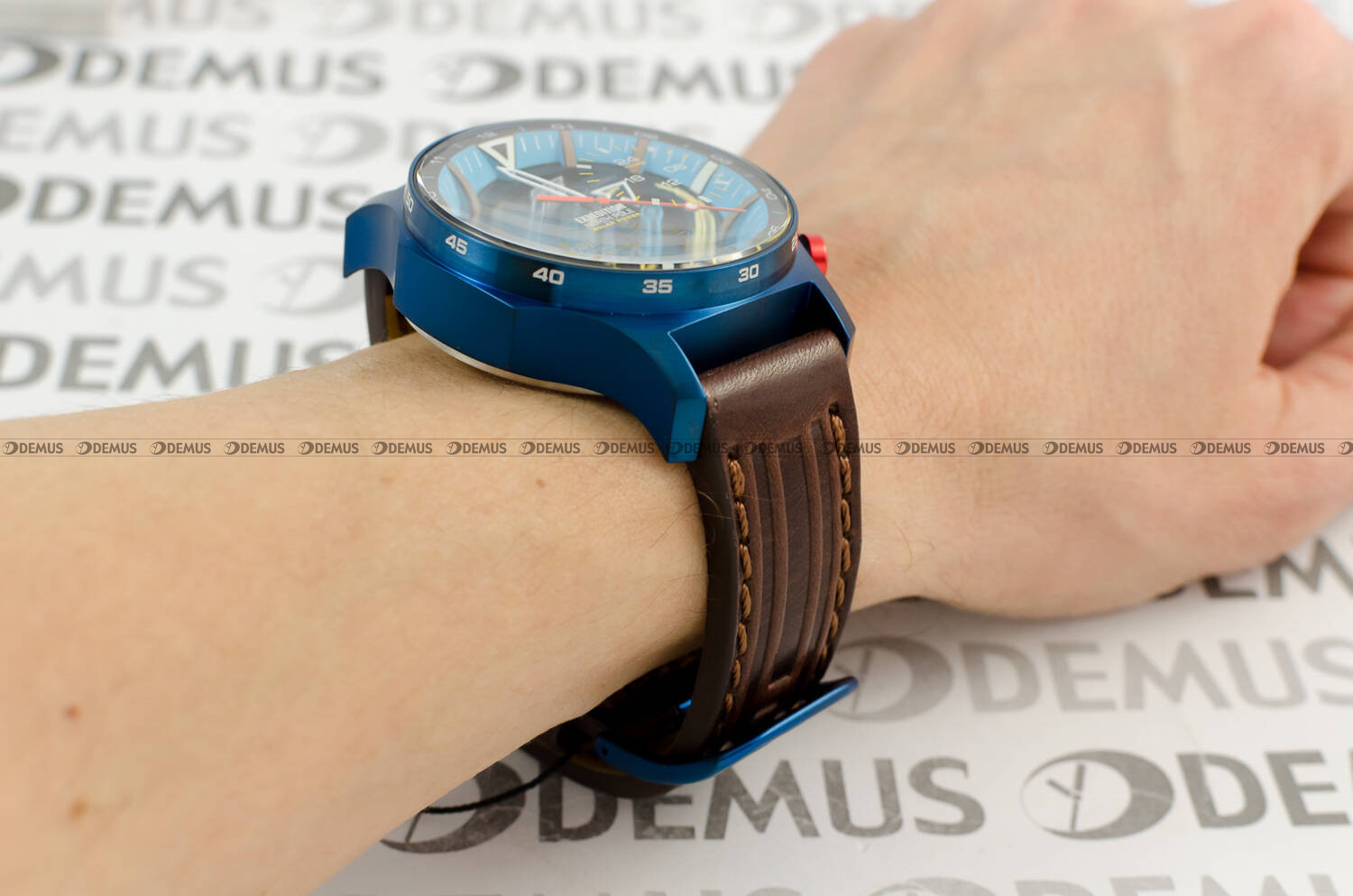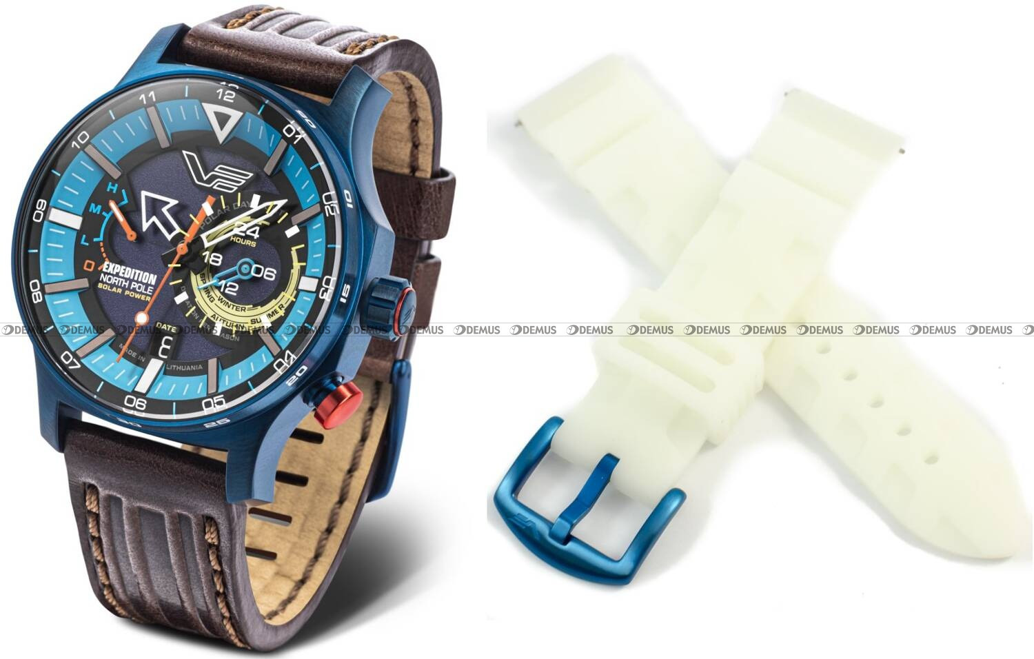 Model Vostok Europe Expedition North Pole "Polar Day" VS57-595D736S2 to zegarek inspirowany ekstremalnymi warunkami polarnymi, dostosowany do wymagających użytkowników. Wyróżnia się solidną, 47-milimetrową kopertą w niebieskim kolorze, która współgra z niebieską tarczą o czytelnym układzie wskazań. Brązowy skórzany pasek dodaje mu klasycznego charakteru, natomiast dodatkowy luminescencyjny silikonowy pasek w białym kolorze zapewnia lepszą widoczność w ciemności.