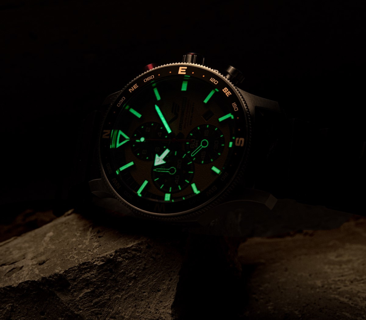 specjalne pokrycie wskazówek zegarka, delikatnie podświetlające w ciemnościach